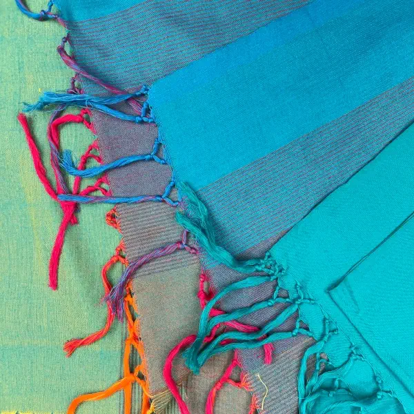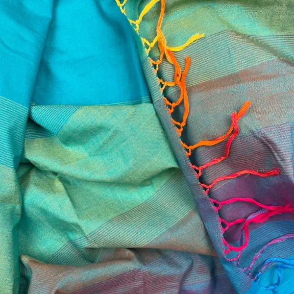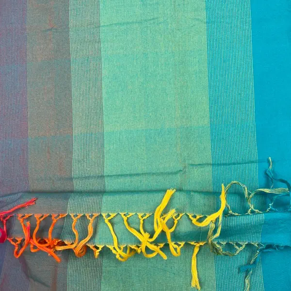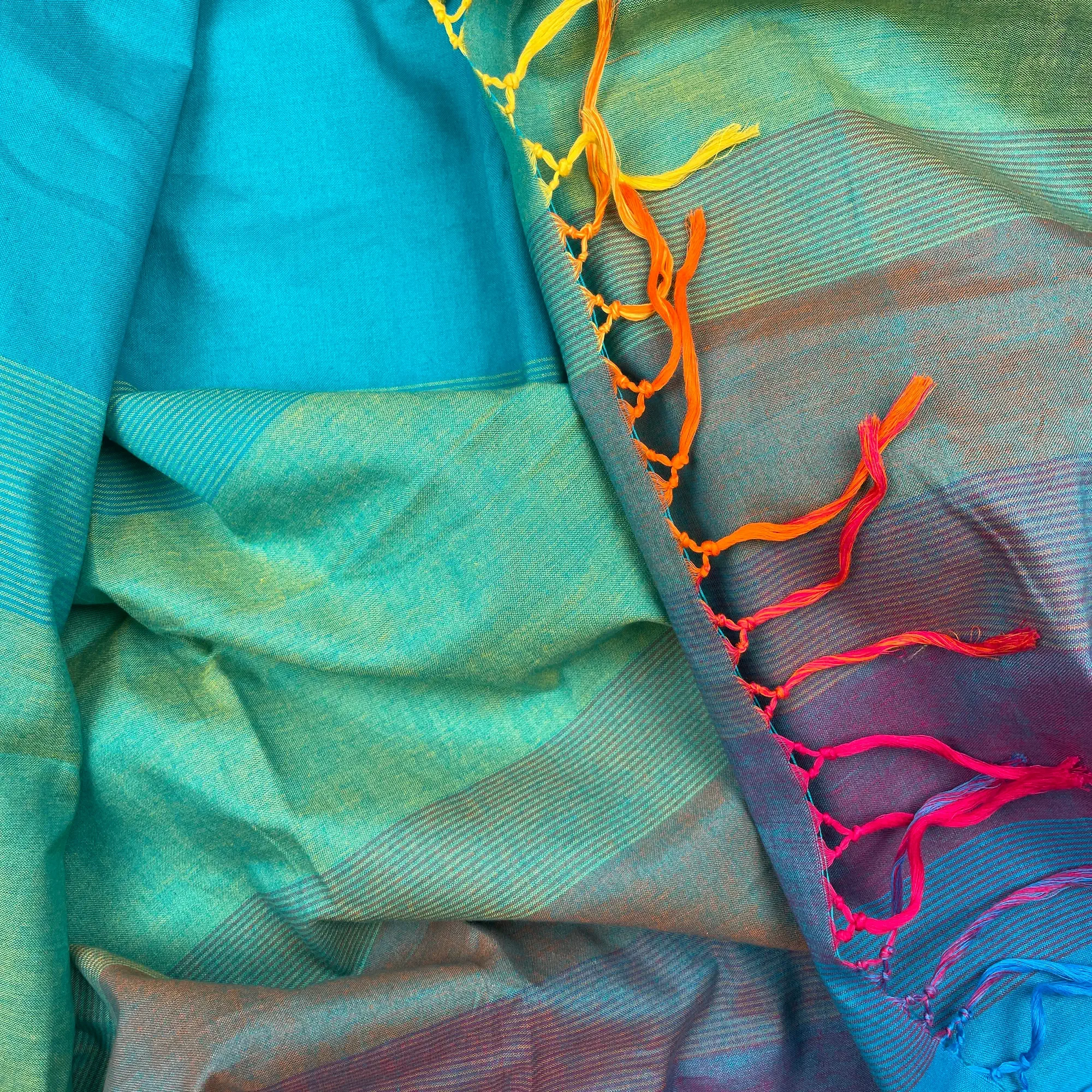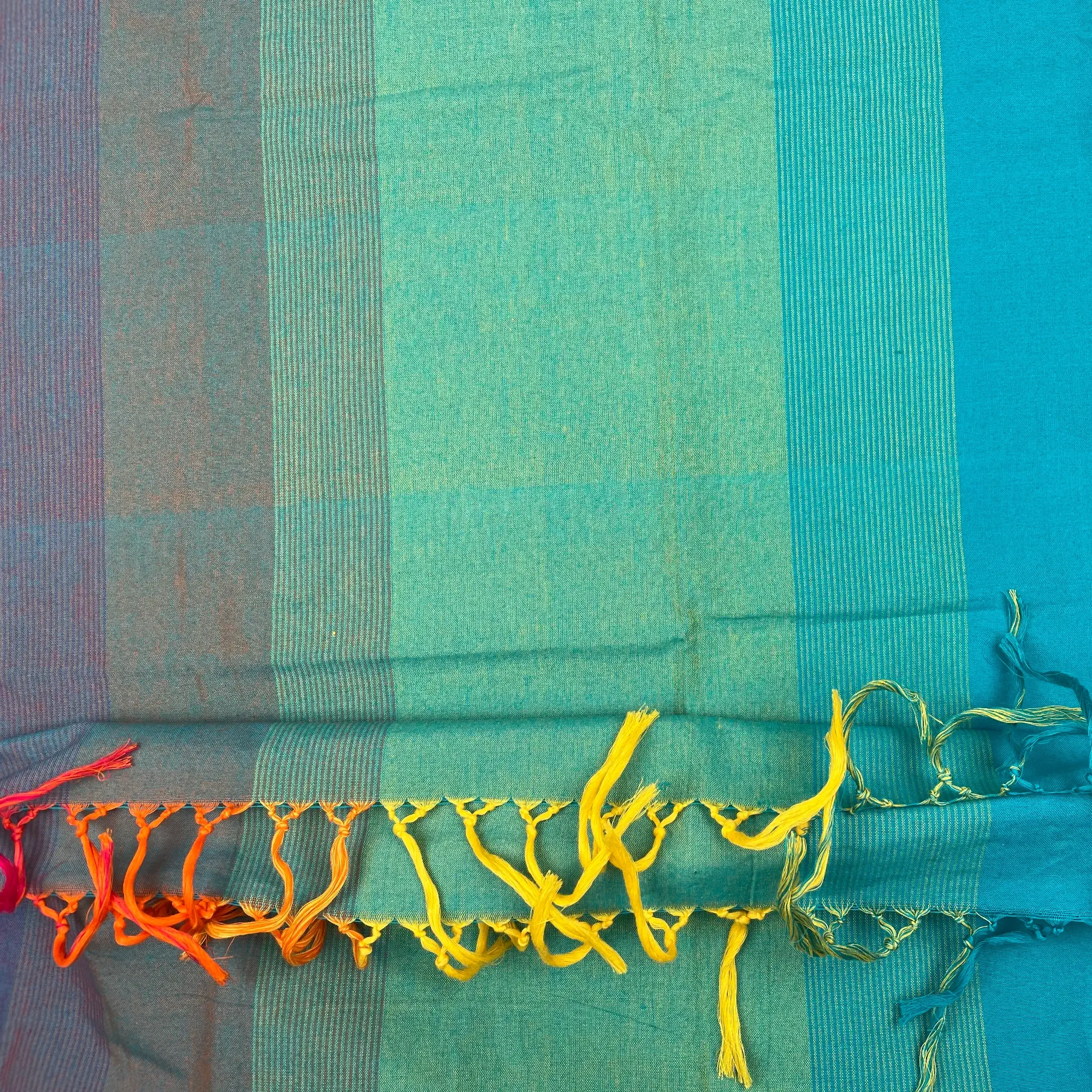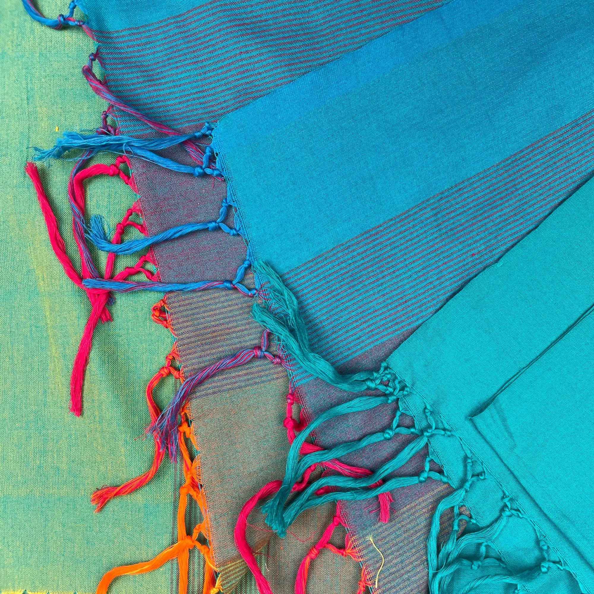 A beautiful shot shade mix of Blue with hints of deep Pink, Orange and Lemon Yellow. Our love for lean stripes and softness of cotton comes together here. This stole was handwoven by an artisan, no electricity or conventional energy was used in the process to create it.
